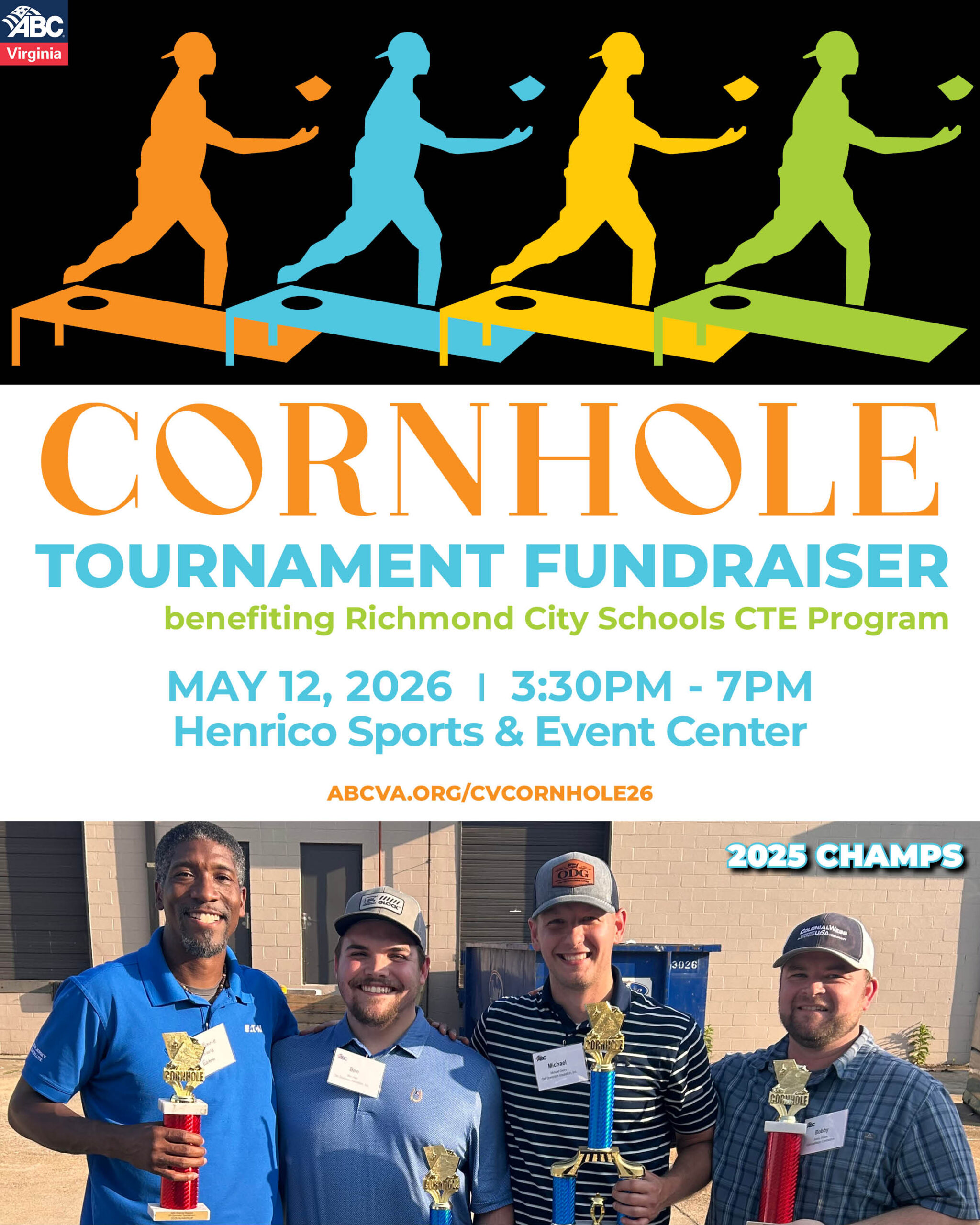 CORNHOLE TOURNAMENT FUNDRAISER BENEFITING RICHMOND CITY SCHOOLS CTE PROGRAM Tuesday, May 12, 2026 | 3:30PM – 7:00PM Cornhole Clash is back! Lock in your teammate, secure your spot, and get ready to compete for bragging rights! Bring your game face and show off your skills at our 4th annual charity cornhole tournament benefiting Richmond City Schools' CTE Program. Register early - limited to 16 teams in a double elimination format. 💪 Prizes for the top two teams! 👀 Not playing? Register as a spectator, cheer for your favorite team, and connect with your fellow ABC-VA members while supporting a cause that will positively impact CTE students in our local community. All proceeds from this event will be contributed to our Young Professional's fundraising efforts to support Richmond City Schools' CTE program. 🪙 Sponsorships help us turn game day into game-changing impact. Help us maximize our fundraising efforts and consider purchasing a sponsorship with your registration! SPONSORSHIP OPPORTUNITIES Commitments needed by May 7 COB Event Sponsor $700 – includes custom branded cornhole board set, one (1) team, one (1) spectator ticket, signage at event, logo/name on marketing materials **4 AVAILABLE** Bar Sponsor $500 – includes one (1) team, signage at event, logo/name […]