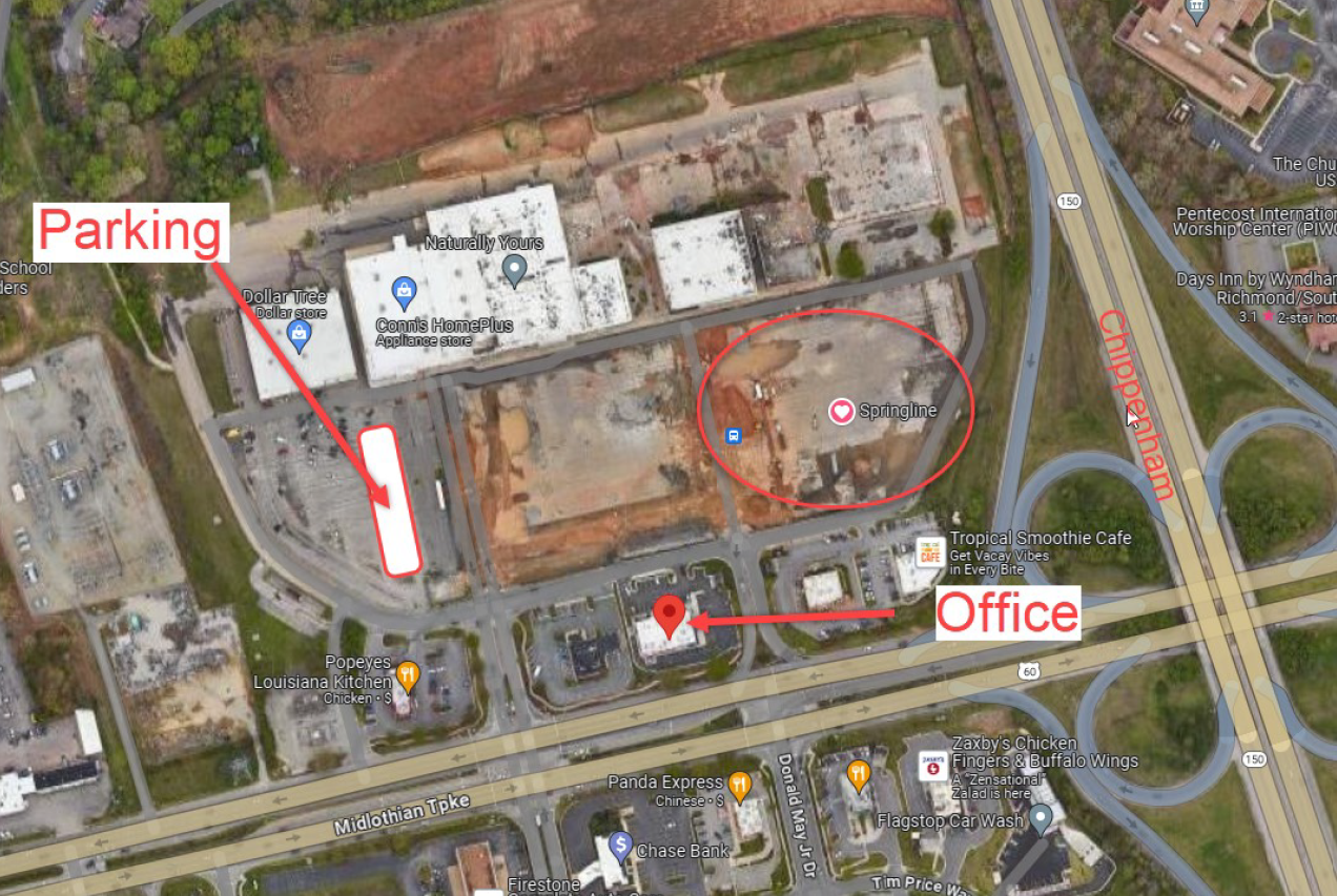 Visitors can park in the area in front of Dollar Tree, which is outside of the limits of construction, west part of the development. From there, visitors should walk to our temporary Hourigan site office at 7106B Midlothian Turnpike (next to Starbucks) to check-in and await the start of the tour. From there, we can walk directly to the site. CLICK HERE TO ACCESS SITE/PARKING MAP